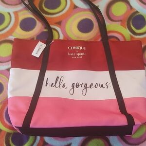 NWT This vibrant Clinique by Kate Spade tote bag showcases a striking color-block design in pink and red, perfect for cosmetics and personal items on travel. Its spacious interior is great for thrifting and shopping at the market! A small dirt spot on one corner (last pic) which will wash out. 15" across top, 12" down, 12" bottom across, 4" bottom width.
