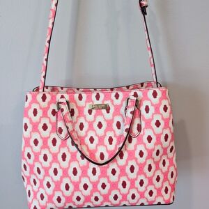 This delightful tote from Kate Spade showcases a playful pink base with a charming red heart pattern, complemented by matching handles and trim. Its structured design offers ample space, making it both stylish and practical for everyday use. has a detachable crossbody strap. clean inside and out and in near perfect condition with no scratched on hardware or plate..has one tiny mark underneath the bag (please see photos).