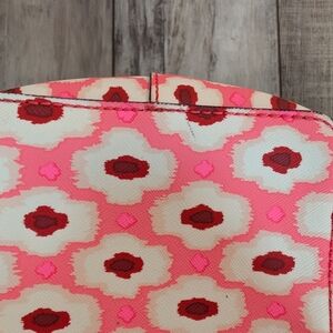 This delightful tote from Kate Spade showcases a playful pink base with a charming red heart pattern, complemented by matching handles and trim. Its structured design offers ample space, making it both stylish and practical for everyday use. has a detachable crossbody strap. clean inside and out and in near perfect condition with no scratched on hardware or plate..has one tiny mark underneath the bag (please see photos).