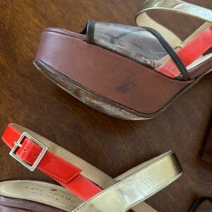 Gently pre worn Kate Spade brown platform heels with clear front band and bright patent orange ankle strap. Some stains on leather outer. Size 9.5.