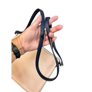 Kate Spade Polly Medium Crossbody bag in neutral beige and white with navy leather strap. Crafted from durable pebbled leather with a zip-top closure and front logo detail. Features adjustable crossbody strap for versatile wear, interior slip pocket, and lined interior for essentials. Medium size offers ample space without bulk, perfect for errands, travel, or daily use. Timeless two-tone color palette pairs effortlessly with any wardrobe. Pre-loved with clean interior & exterior remains stylish and functional. A great find for Kate Spade lovers.