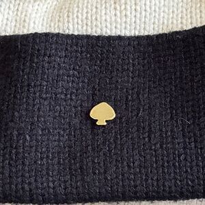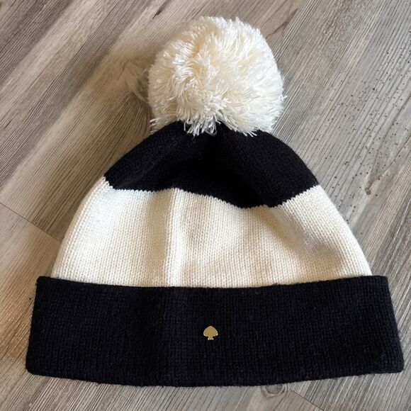Kate Spade Pom Pom Beanie Hat Cap Gold Logo Knit Black Cream Womens One Size