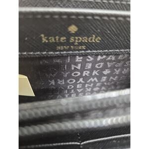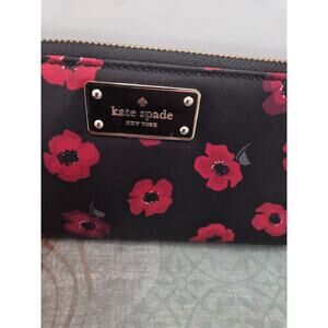 In excellent clean condition. The Kate Spade Poppy Neda Zip-around Wallet Clutch is a stylish and functional accessory designed for women. Made of faux printed leather with a floral pattern, this black multi wallet features a zip-around design with multiple pockets, including slots for credit cards, an interior zip coin pocket, and an interior slip iPhone pocket. It also has an exterior slip pocket and full-size bill compartments for organization. The wallet showcases the iconic Kate Spade New York logo and is a perfect blend of designer style and practicality.