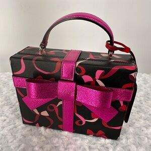 Kate Spade Present Crossbody Convertible Handbag. Metallic accents, use the removable crossbody strap or top handle. Super cute and kitschy. My iPhone pro max fits inside with a case so it’s quite roomy for being a box purse.