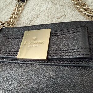 Elegant and versatile, this Kate Spade black leather shoulder bag is perfect for any occasion. Featuring a sleek design with gold chain accents, it adds a touch of sophistication to your outfit. Black pebbled leather adorned with black leather bow on the front with gold signature emblem