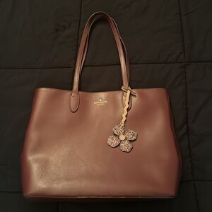 Kate Spade Purple/Maroon ♠️ Medium sized tote. 3 pockets on the inside, one zips closed. The top zips closed. Smooth Leather feel to bag. Flower attachment on the handle. A couple of scuffs, but like new bag. Please see pictures. Inside is a gorgeous purple red print. ♠️