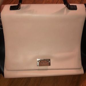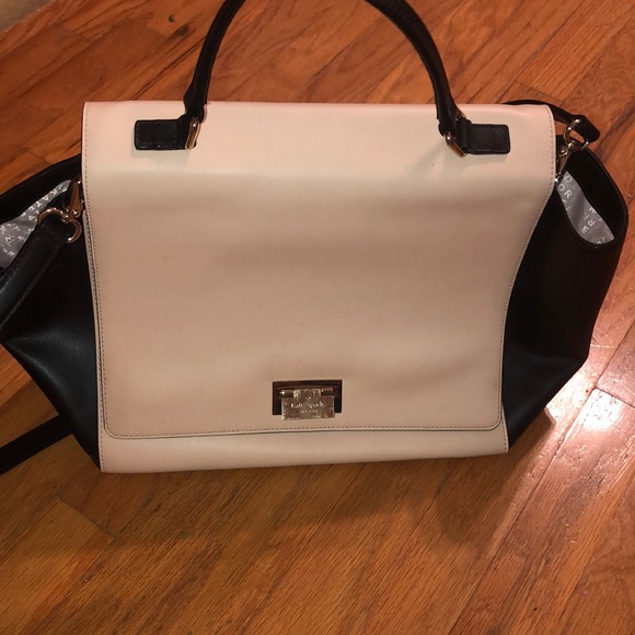Light pink and black Kate Spade purse. This purse is very roomy and very beautiful! Come with a black adjustable shoulder strap. I love this bag and used it for about a month. It does have a few light dirt marks on the bottom of the inside, and on the front flap and back, but I have never tried to clean it. I don’t imagine these would be hard to get off from my experience with other KS bags though. They are not very noticeable. This is an AUTHENTIC bag.