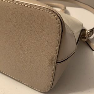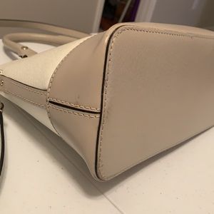 Gently used Kate Spade purse with handles and shoulder strap. Three inside pockets, one of them is a zipper pocket. A little bit of wear on the bottom. Approximate dimensions at base are 12.5”x5”x9.5”