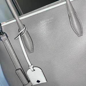 Light pink inside with small interior zipper pocket. Long strap is detachable. Grey leather exterior.