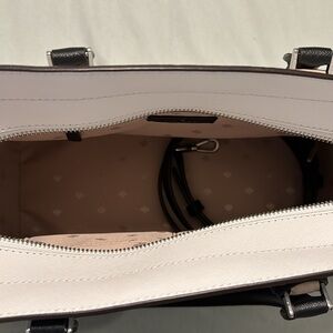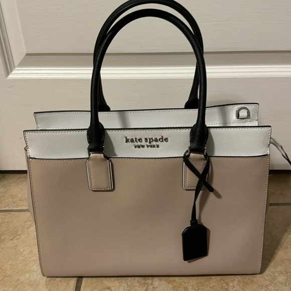 Tan white and black Kate spade purse. Like new. Comes with long strap and dust bag