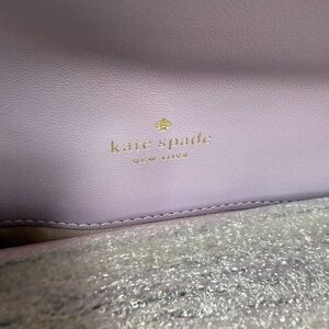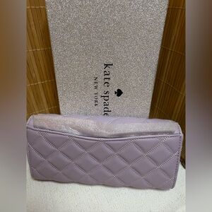 Kate Spade New York quilted leather wallet in a lovely lavender shade. Features the signature pyramid turn-lock closure in polished gold-tone hardware, quilted diamond stitching, and multiple compartments for easy organization.