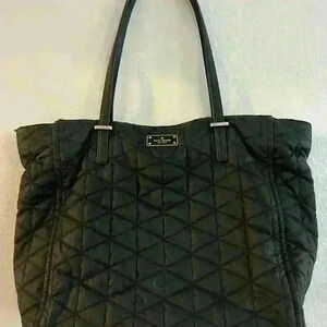 Kate Spade Black Wilson Road Quilted Tote/Diaper Bag. This great looking bag is in used condition with some wearing on the base corners and fraying and cracking on the top of the handles. Brand new the retail price of this purse was $398 but with consideration of wear issues but also consideration of overall condition this purse is now $75!!