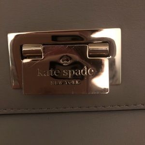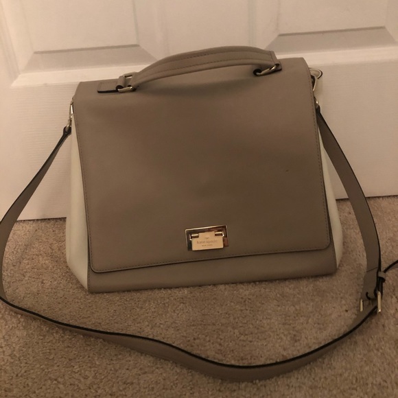 Kate Spade color block large satchel bag including shoulder strap. In fair condition. As you can see, some buckling has occurred in the leather on the right side so I am willing to take fair offers. Gold hardware. Inside pockets including zippered pocket.
