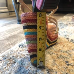 Rainbow Kate Spade size 7.5 Wedges - like new. Worn 3 times. Slight scuff near toe on the gold leather but can barely see because of the metallic. Wedge height: 5 inches.