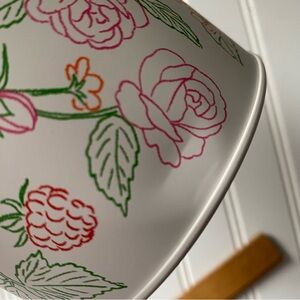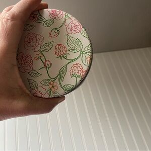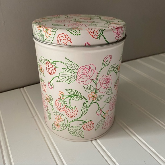 This is a Kate Spade Raspberry Rose tin canister, approximately 5 inches tall. Perfect for kitchen storage or adding a touch of charm. There is a slight dent and bottom appears to be painted ivory - please see pics.