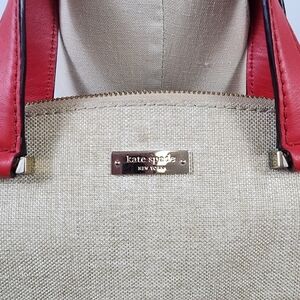 You are purchasing a gorgeous and rare Kate Spade New York bag. It is well designed in lightweight beige canvas and smooth red leather. This handbag is a versatile everyday option. It Features top handles. (note: bag is missing shoulder strap). It has a top zip closure, a light beige fabric interior which includes one zip pocket and two open pockets.