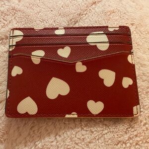 Stylish card holder in vibrant red. Adorned with cream heart design. Features iconic Kate Spade logo.