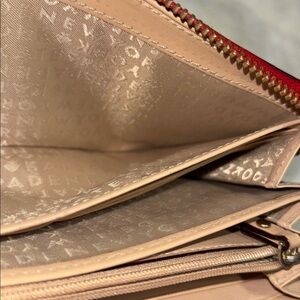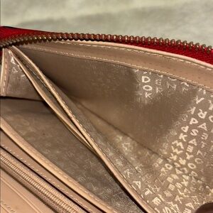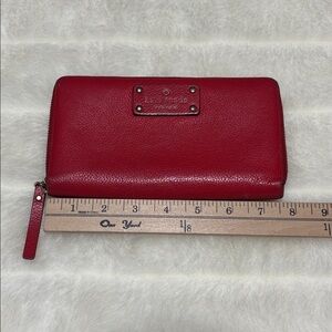 Elegant Kate Spade New York wallet crafted in red pebbled leather. Features a secure zip-around closure with leather zipper pull, multiple card slots, ID window, and coin pocket. Classic metal logo plate on front. Clean interior and smooth zipper — a perfect everyday or travel wallet!