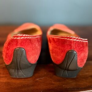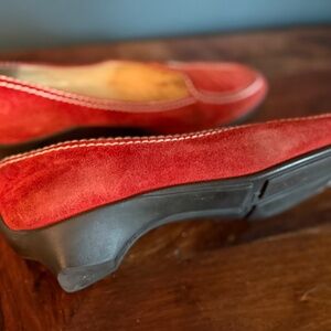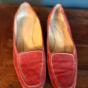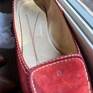 Red suede Kate Spade loafers with white stitching, black rubber detail on heel and little embossed logo on the top. Very cute & comfy.