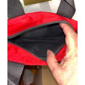 Kate Spade small red tote bag. Black handles and hardware. Zipper closure. Minor stain on front. Clean interior. Great condition. See pictures for additional details.