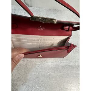 This is a kate spade new york Kate Reegan crossbody wallet in a medium size, made of smooth leather in a candied cherry red color. It features a solid pattern, gold hardware, a detachable strap, and a beige polyester lining. The exterior and handle/strap are also made of leather, with the handle/strap being red in color.