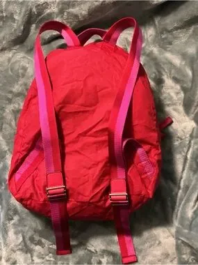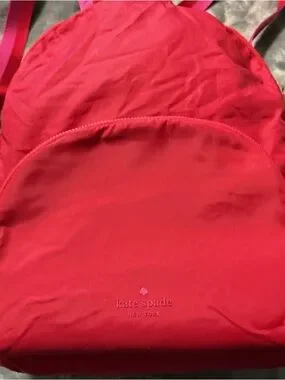 Vibrant red nylon backpack by kate spade. Front zip pocket and subtle logo. Smooth, streamlined shape. Casual and functional for everyday wear.