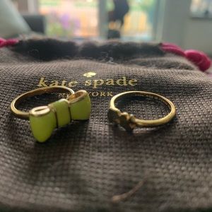 Set of 2 Kate Spade rings in good condition! One ring features the classic, double spade design and the other, a neon yellow bow. Wear them together, alone, or stacked on top of the other for a chic look! Size 6! Comes with Kate Spade dust bag for safe keeping.