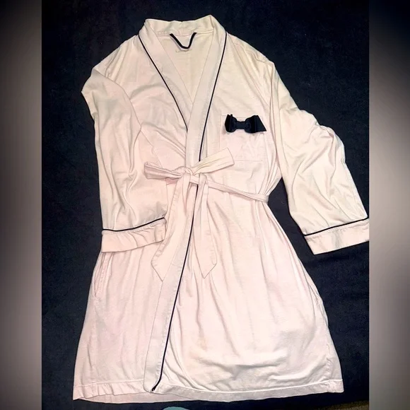 Kate Spade robe with pocket on the chest of the left side. Light pink robe with black bow and black trim. Inside tie and outside tie. Size Medium