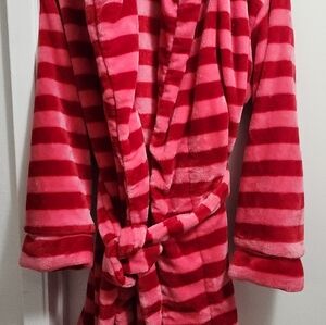 Cozy plush robe with red and pink stripes. Perfect for lounging.