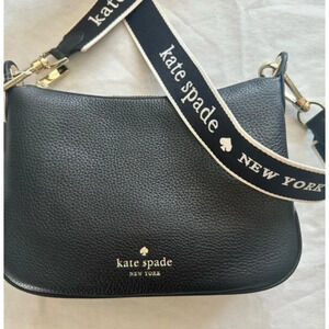 ***2nd and 3rd photos are the one im selling*** The Kate Spade Rosie Small Crossbody Bag in pebbled leather, featuring a black and white logo strap, is a versatile accessory suitable for various occasions such as travel, parties, casual outings, and formal events. With a compact size of 9.5 inches in width, 6.5 inches in height, and 2.5 inches in depth, this stylish bag has a zip closure, gold hardware accents, and a detachable crossbody strap. The classic black exterior color and black lining complement the overall design of this sophisticated handbag from kate spade new york, making it a must-have for any fashion-forward woman.