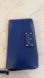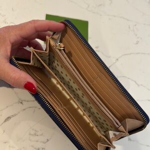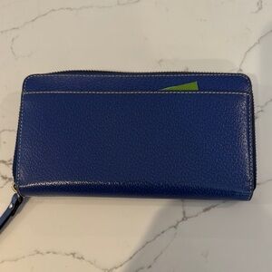 Elegant leather wallet in royal blue. Features secure zip closure and stylish design. Excellent condition. Very clean. Tan interior plenty of spaces for id and credit cards. Zippered compartment for change.