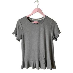 Gray comfy tee shirt with a ruffle at the hem and sleeves by Kate Spade New York. Great preowned condition. Size small. Measurements in photos.