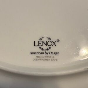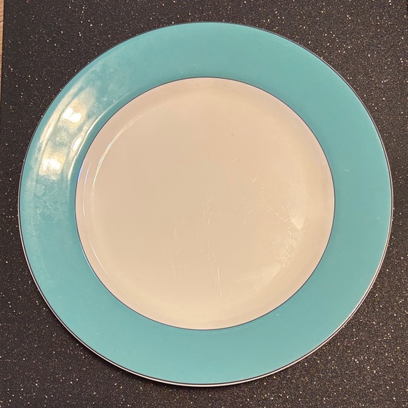 Elegant white center with a bright turquoise rim. Simple, modern styling for table settings. Fine gloss finish and subtle silver banding. Classic kate spade color contrast.