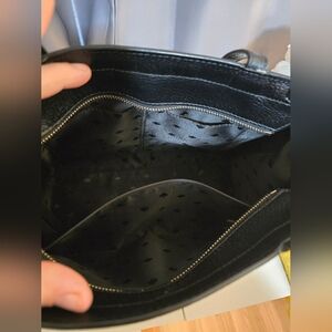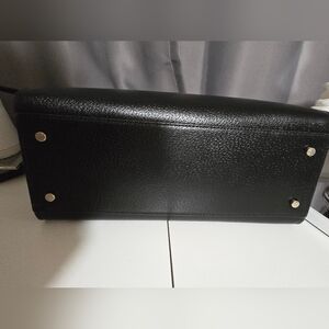 Large Black leather Kate Spade shoulder bag with longer adjustable crossbody strap. In barely used condition. 2 cut like blemishes on front of bag as seen in pic. Inside of bag very clean measurements: W 12.5" H 10"6"D