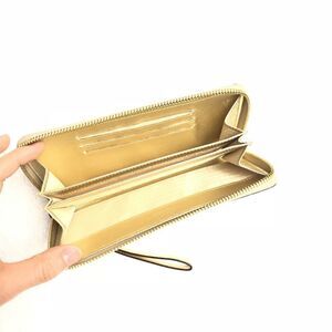 Saffiano leather construction. Zippered closure. Cash and Card slots. Built-in wrist strap.