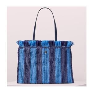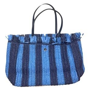 Two tone striped raffia straw tote with top handles, tie closure, and roomy interior with pockets. “Blazer blue multi” colorway.
