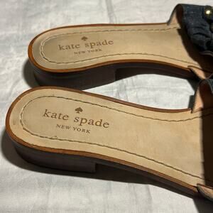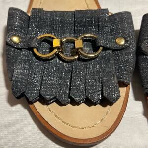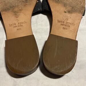 -open toe sandal with fringe-adorned denim is accented with goldtone hardware and designed by KATE SPADE with leather sole and kiltie heel.