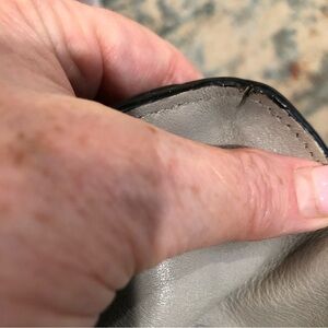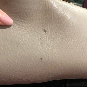 The bag shows light discoloration, scuffs, and minor cracks in the binding. The handheld straps have some discoloration, and the inner lining has a small stain in the front compartment. Despite signs of wear, it remains sturdy and functional. Please review photos for details.