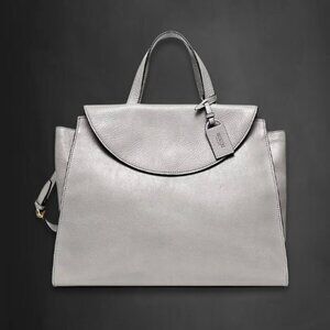 This Kate Spade Saturday "The A Satchel" is crafted from light gray pebbled leather, featuring a spacious design with multiple compartments and pockets. Equipped with sturdy hand straps (5” drop) and a detachable shoulder/crossbody strap, this versatile bag is perfect for everyday use. Though pre-loved, it remains structurally sound and stylish, offering a blend of functionality and elegance.