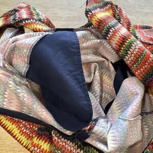 Geometric stripes give a retro feel. Front darts and has pockets.