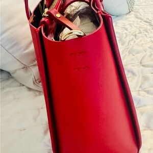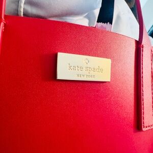 Elegant red tote by Kate Spade. Features a sleek design with a stylish tag accent.
