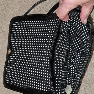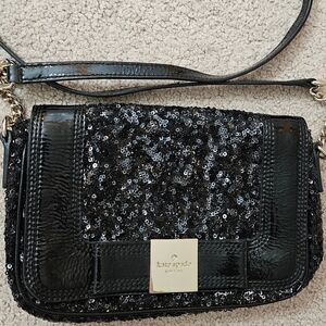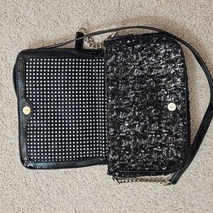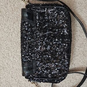 Black Sequin bag with leather accents. Long adjustable strap is leather with goldtone chain. Bag measures 9" x 7".