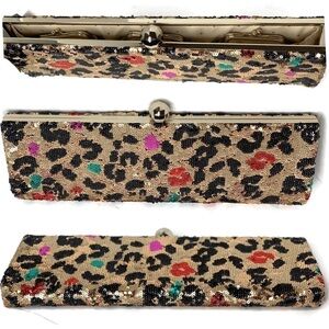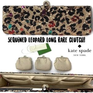 Very Rare Clutch Bag. This is an older original Kate Spade that is a very long (17”) Sequin leopard clutch with gold, black, and pops of red. Her traditional leopard print. It has 3 inside pockets for 3 separate coin bags. Gorgeous!