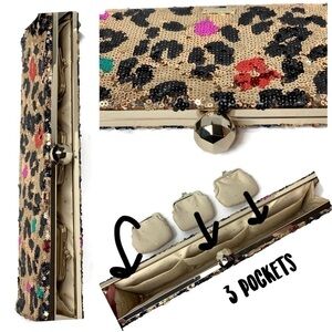 Very Rare Clutch Bag. This is an older original Kate Spade that is a very long (17”) Sequin leopard clutch with gold, black, and pops of red. Her traditional leopard print. It has 3 inside pockets for 3 separate coin bags. Gorgeous!