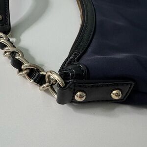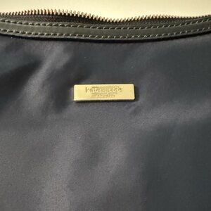 This Kate Spade shoulder bag features a slouchy hobo-style shape in navy and black nylon. Made from a soft material, it is accented with gold toned hardware and a single strap that adds to its stylish look.