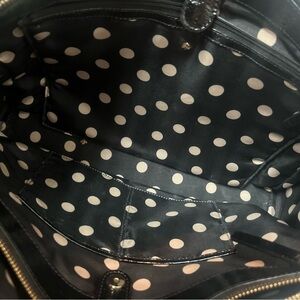 Elegant black tote with a glossy finish. Features sturdy handles and a spacious interior. Roughly 14.5x10 small crack under the handle.- see picture