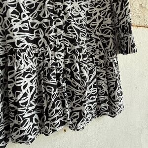 Playful black and white abstract print shirtdress from Kate Spade shirt brings the perfect mix of whimsy to the office. Dress features relaxed fit, button front, and long sleeves. The drop waist finishes in a soft ruffle hem so it moves when you do. Cotton rayon keeps it light and drapey, she's an easy statement that goes office to cocktails with nothing but a shoe change.