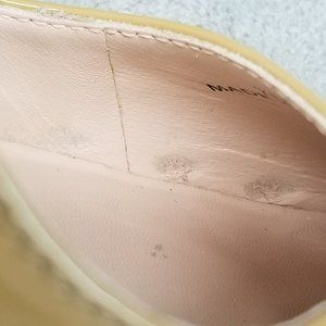 Has discoloration and scuffs on the heel cups and toe wear on the lining as shown.