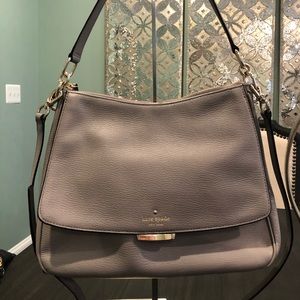 Kate Spade pebbled leather shoulder/crossbody bag. Large useable front pocket with gold snap closure. Zippered closure. Inside there is a zippered pocket and two useable pockets. Very spacious. Detachable crossbody strap. 9 inch shoulder drop. Mark on zipper pull shown in photo 9.