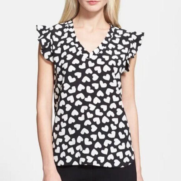 Kate Spade Silk Dancing Hearts Flutter Sleeve Top Ruffle Blouse Shirt Print Cute